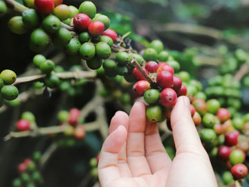 More than 80% of the worlds coffee is hand-picked and is harvested from ripe red coffee cherries. Inside of the coffee cherry are two seeds, which are dried and roasted, eventually becoming a cup of coffee. For every two tons of coffee cherries picked, nearly one ton of the outer peel and fruit, known as cascara, are discarded.